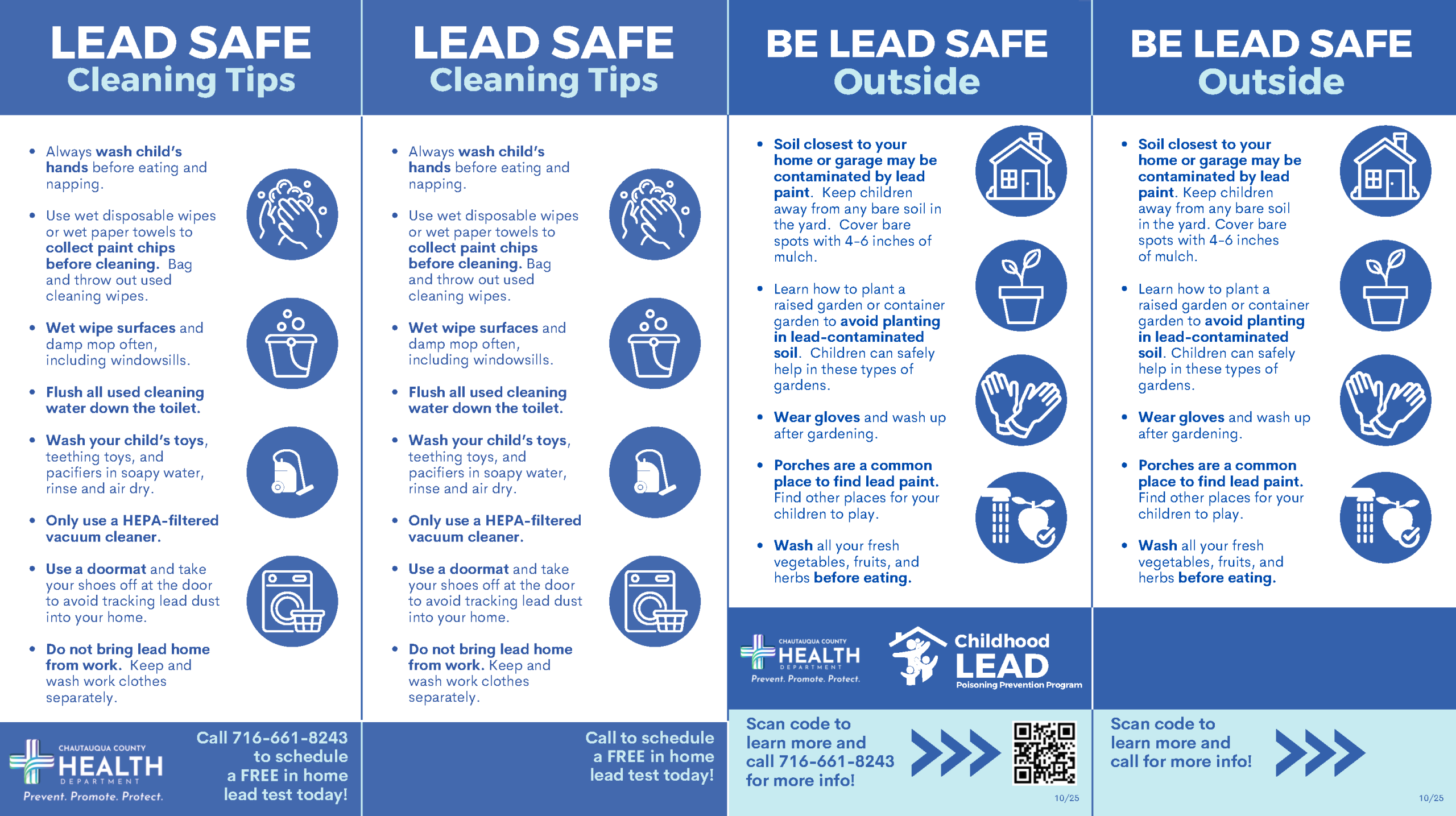 Chautauqua County Health Department; lead poisoning prevention; NLPPW; National Lead Poisoning Prevention Week; ILPPW; International Lead Poisoning Prevention Week; door hanger; 2025; | Be Lead Safe Rack Card Template